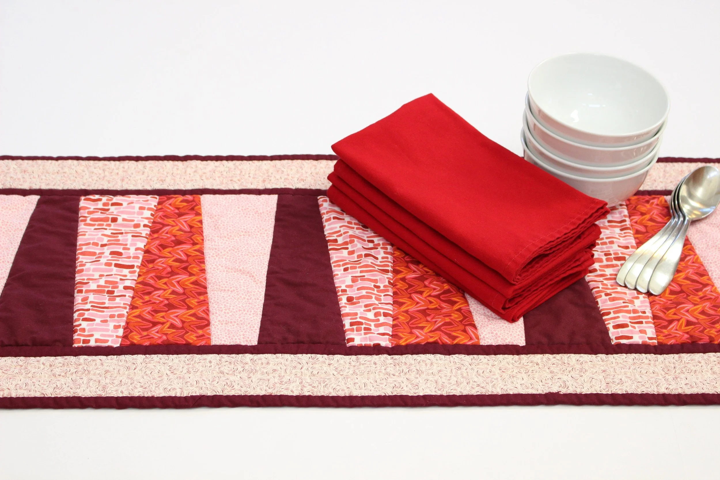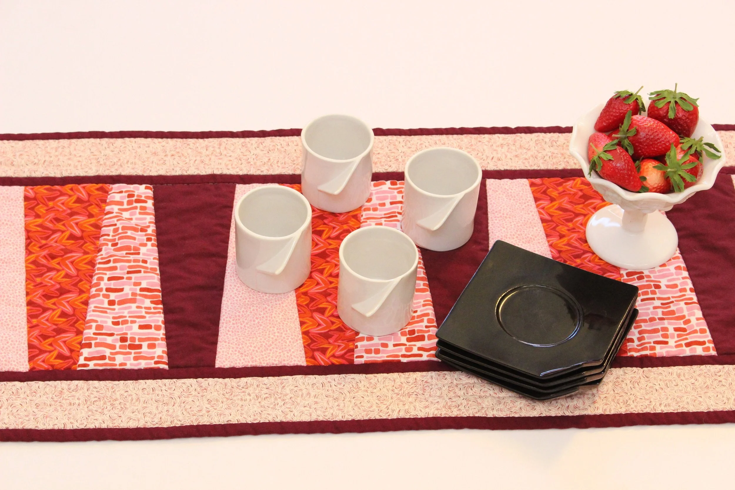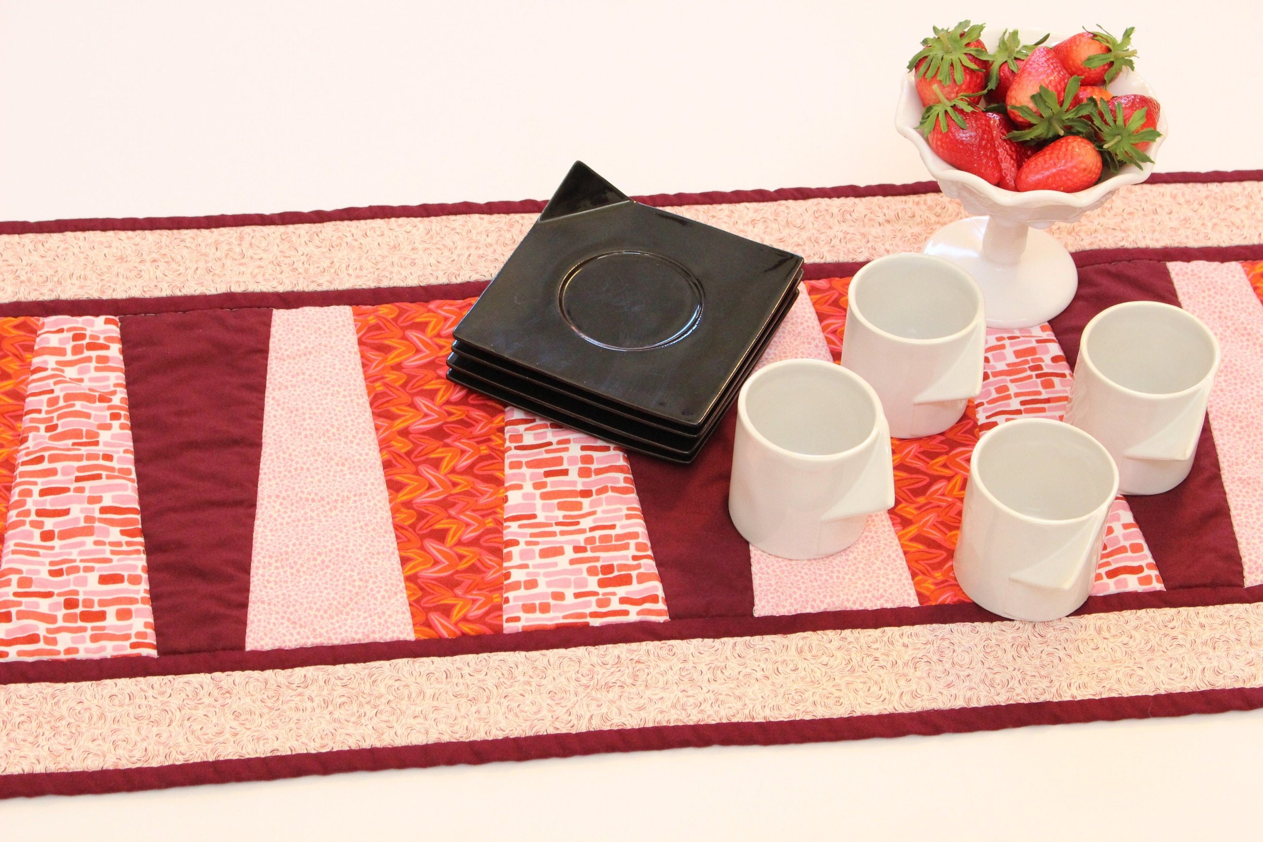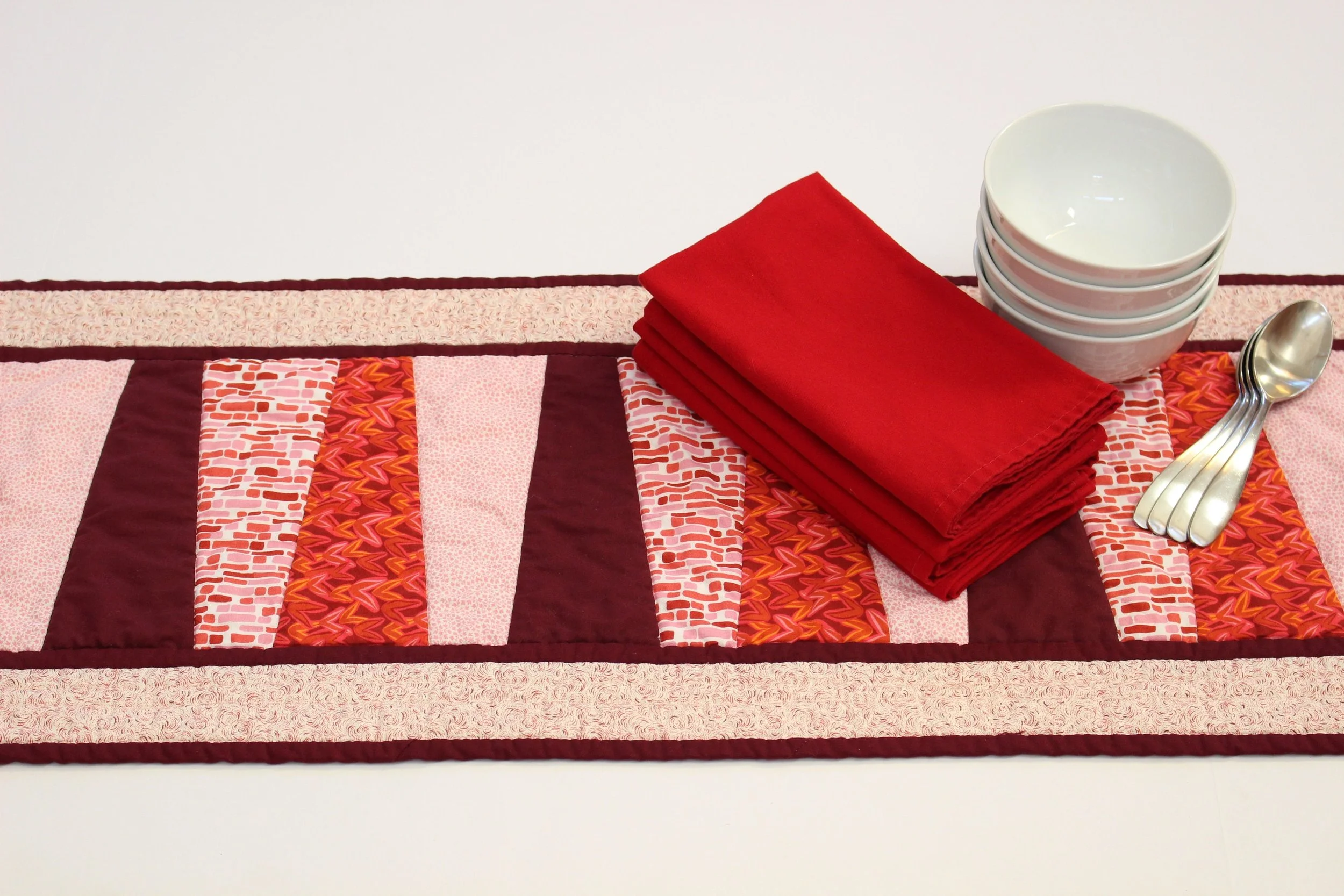 Fabulous handmade 100% pure premium cotton table runner is perfect for decorating your home for brunch, dinner party or daily dining. Classic quilted table topper is machine pieced in a playful mix of red and pink hearts, mosaic and ditsy prints highlighted with a solid deep, rich burgundy. It looks wonderful on either an island, buffet, bare table or layered on a crisp white tablecloth. Top it off with a dessert or drinks display or your favorite centerpiece. This runner is triple layered and quilted with all natural lightweight cotton batting. It is backed with a natural unbleached cotton fabric. Pretty and practical, easy care machine washable. Size: 14" wide x 50" long.
