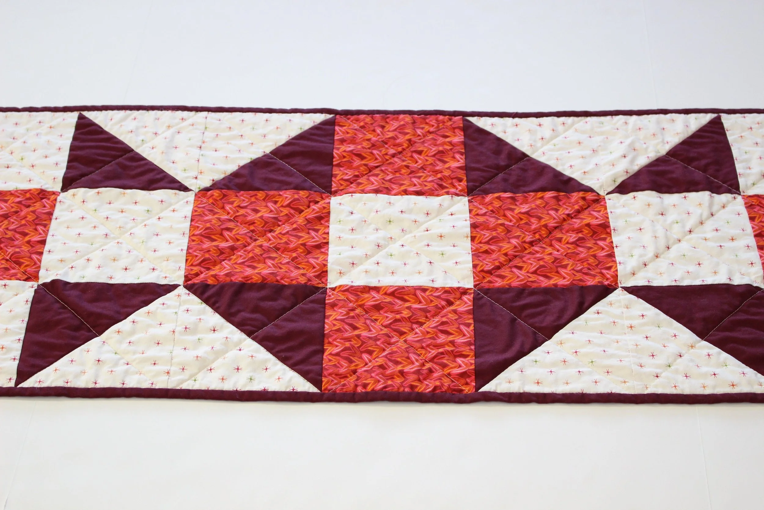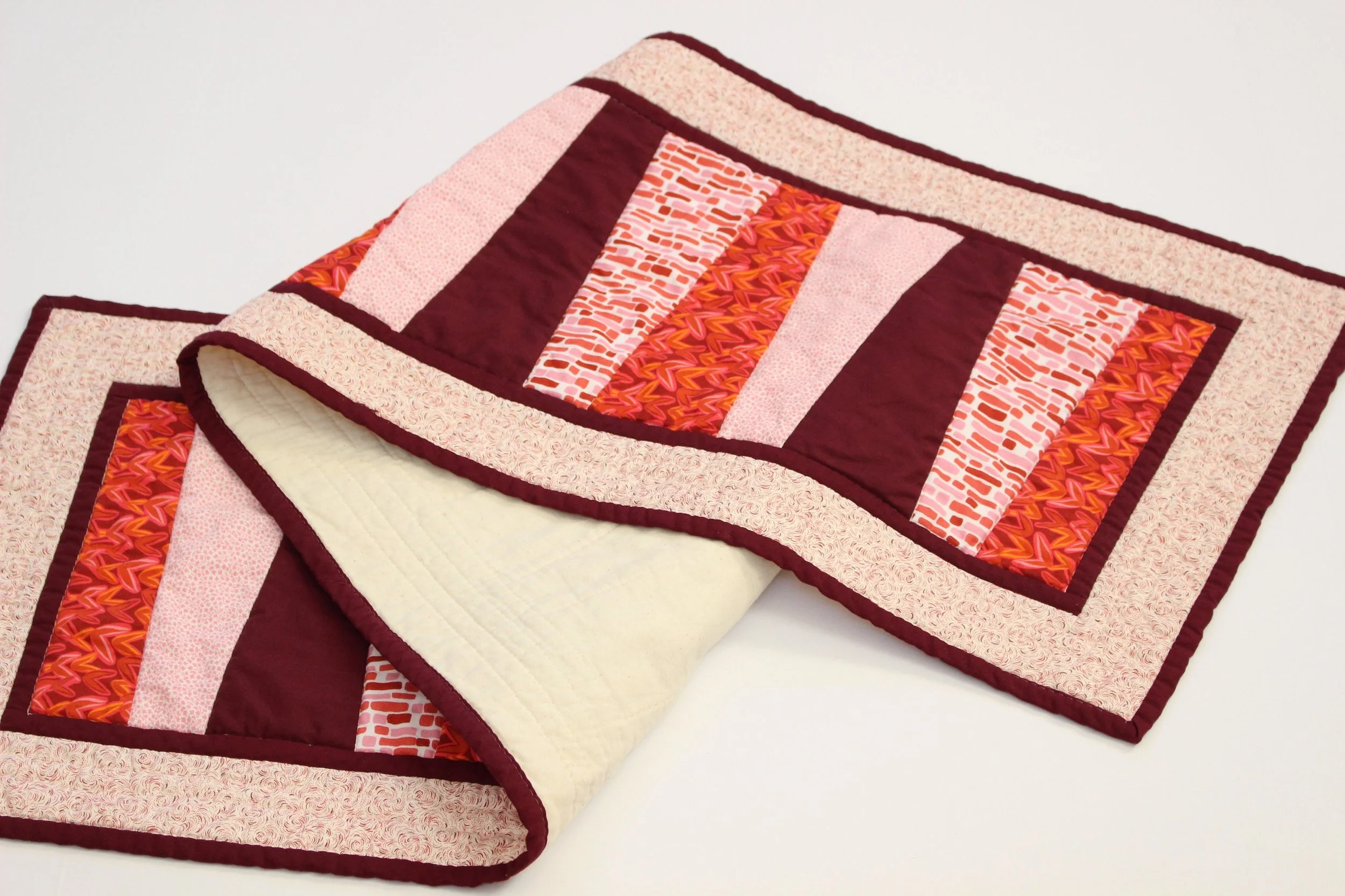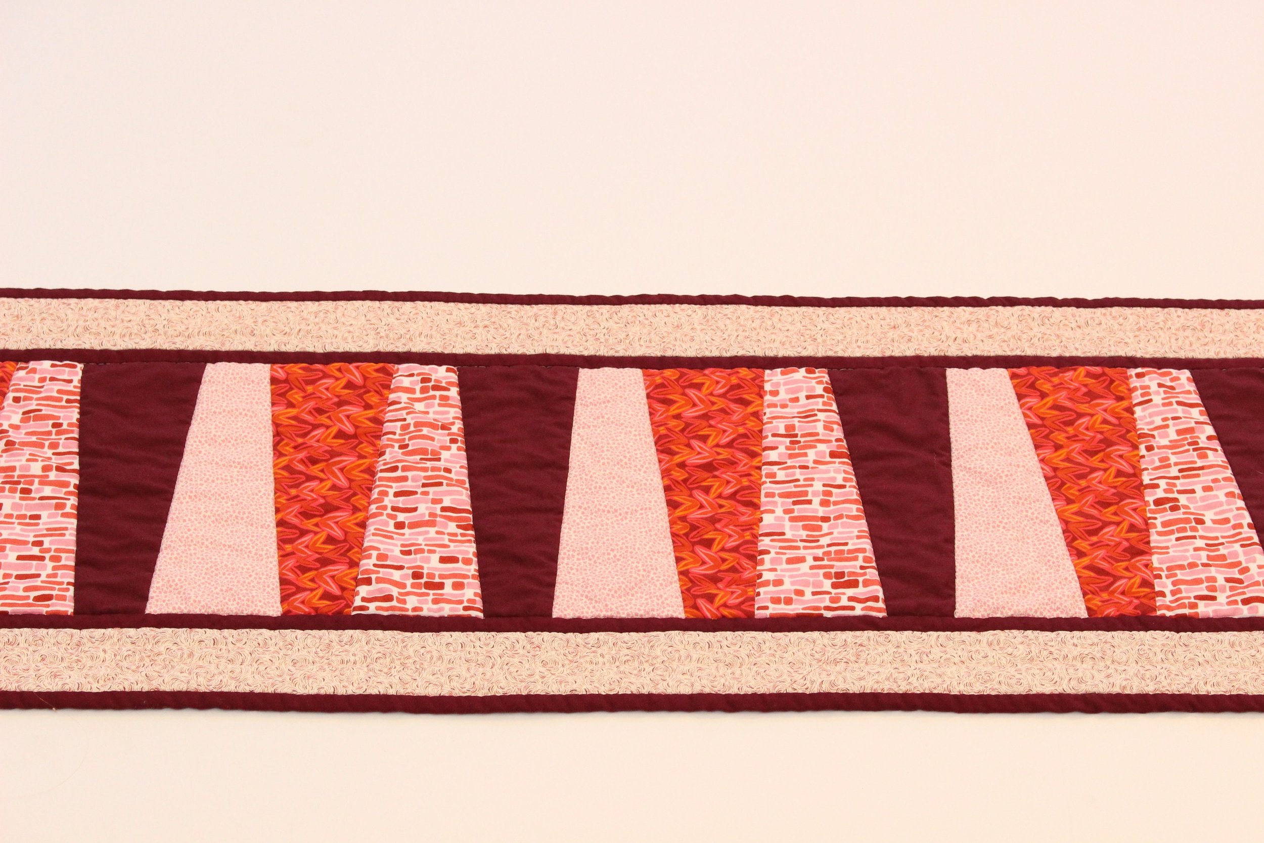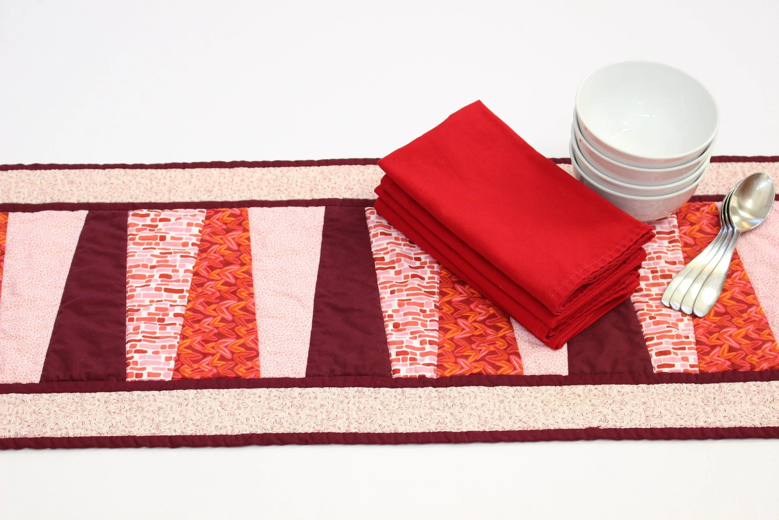 Fabulous handmade 100% pure premium cotton table runner is perfect for decorating your home for brunch, dinner party or daily dining. Classic quilted table topper is machine pieced in a playful mix of red and pink hearts, mosaic and ditsy prints highlighted with a solid deep, rich burgundy. It looks wonderful on either an island, buffet, bare table or layered on a crisp white tablecloth. Top it off with a dessert or drinks display or your favorite centerpiece. This runner is triple layered and quilted with all natural lightweight cotton batting. It is backed with a natural unbleached cotton fabric. Pretty and practical, easy care machine washable. Size: 14" wide x 50" long.