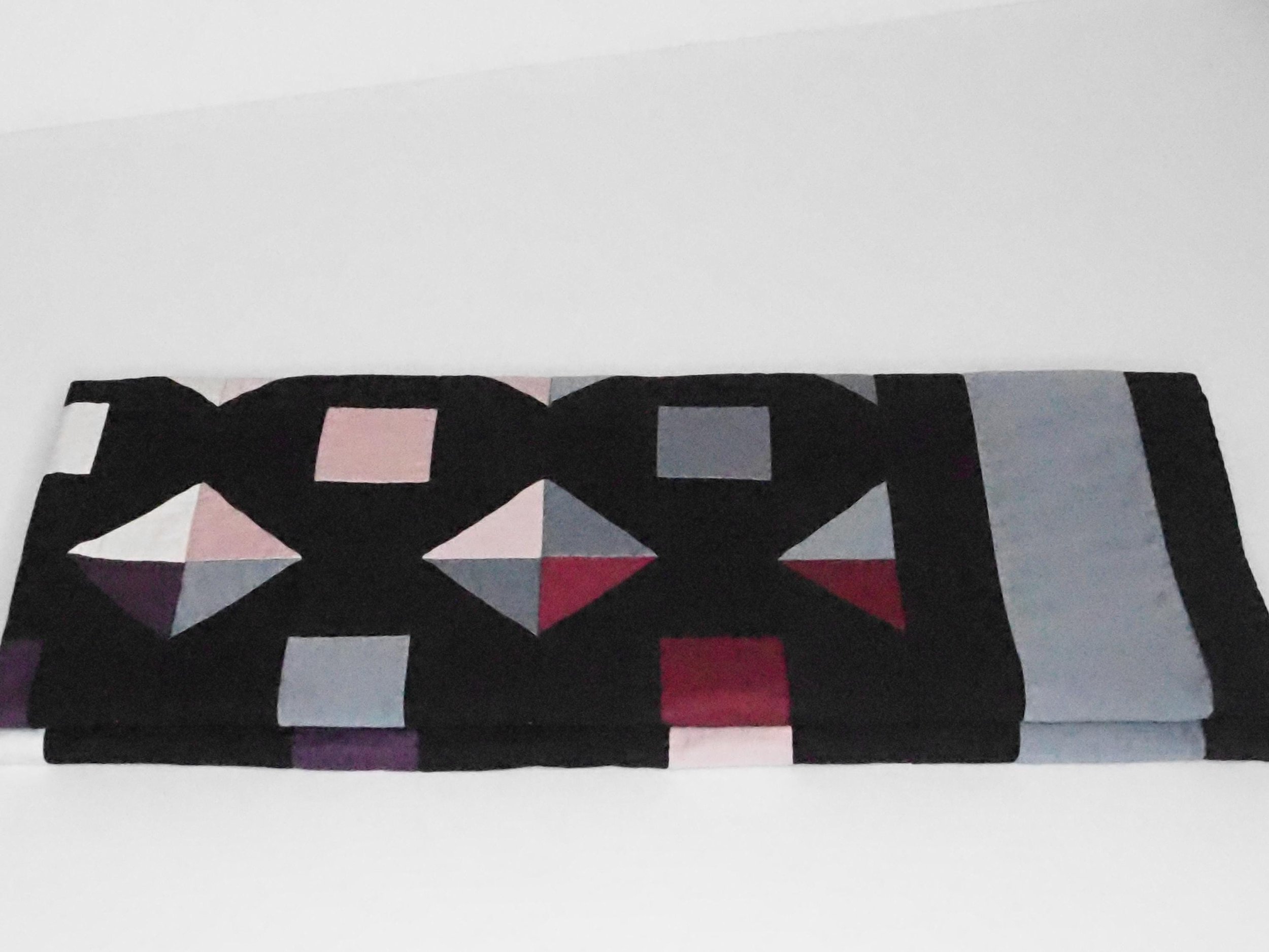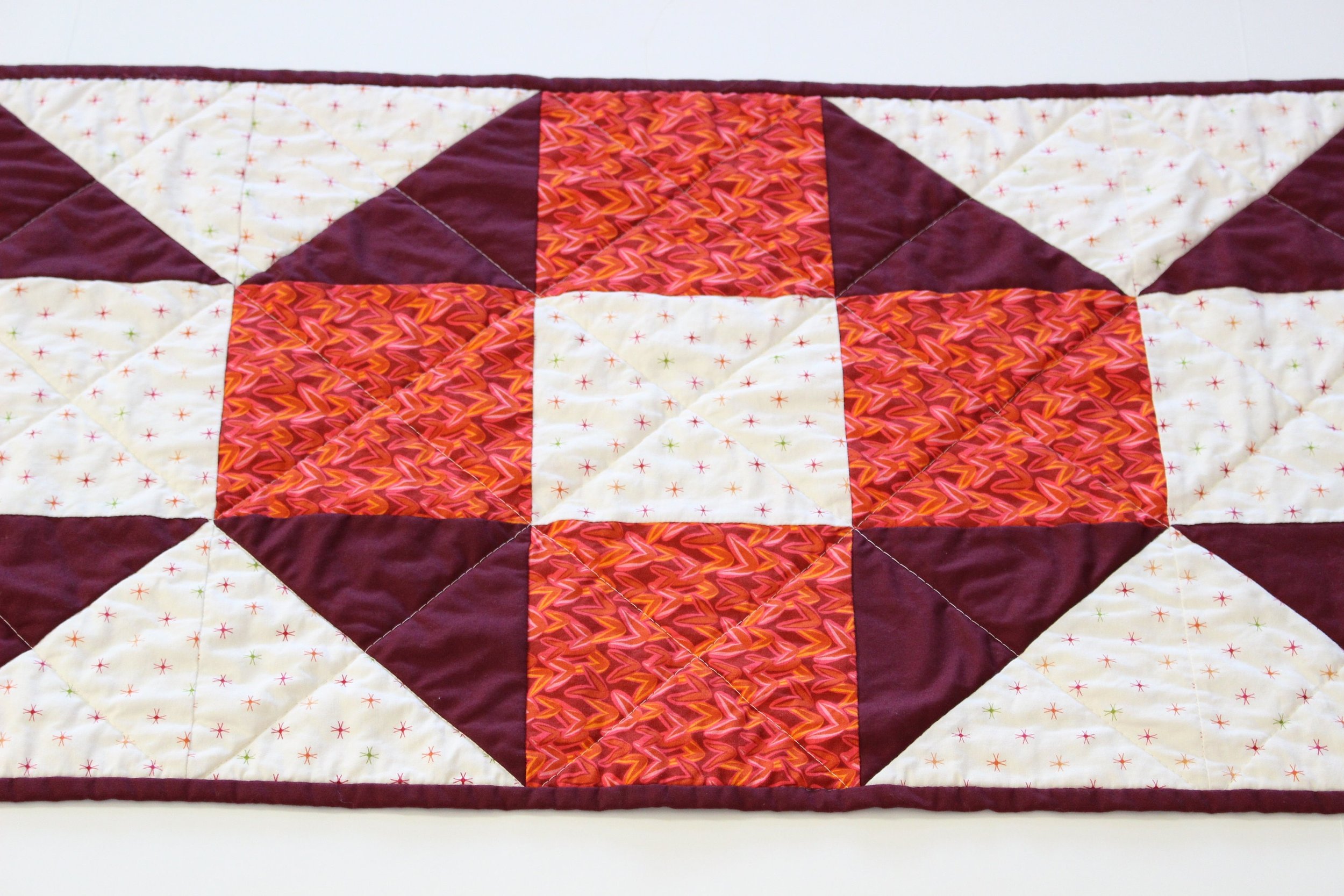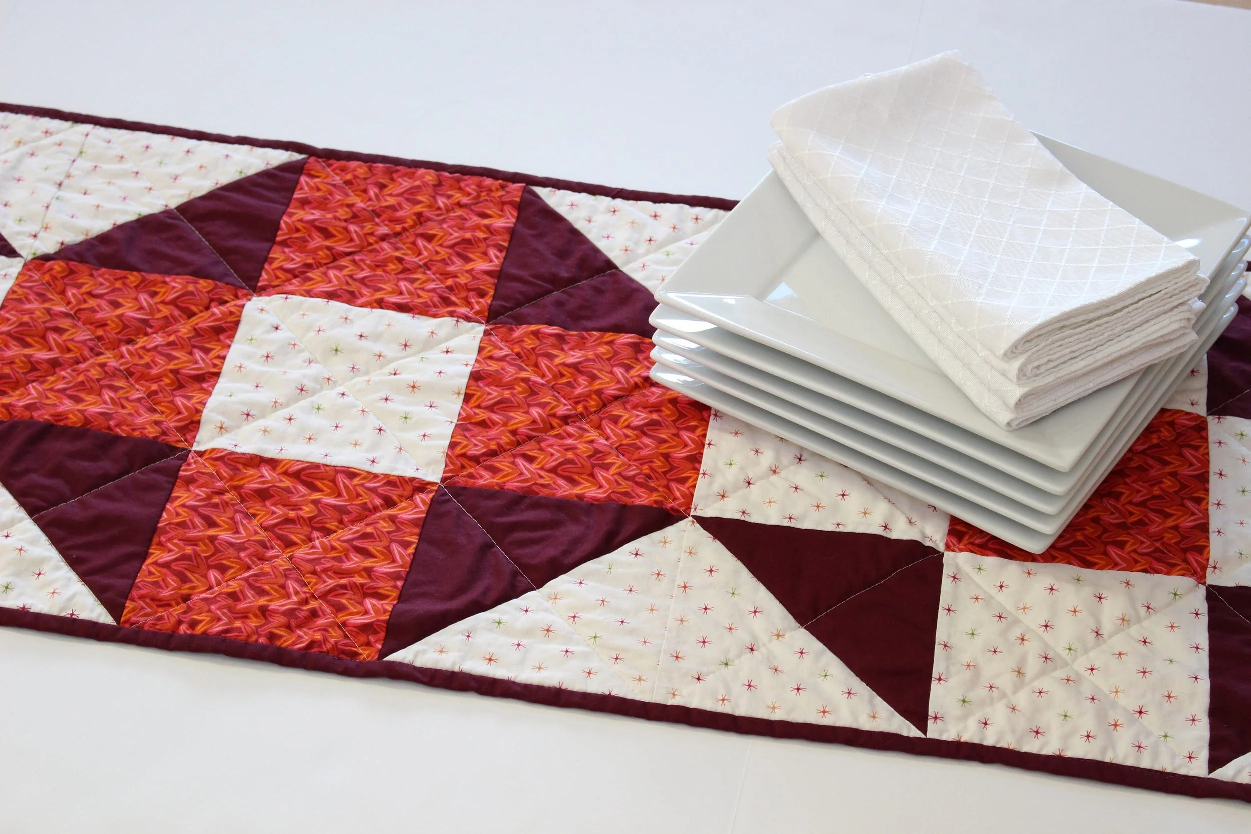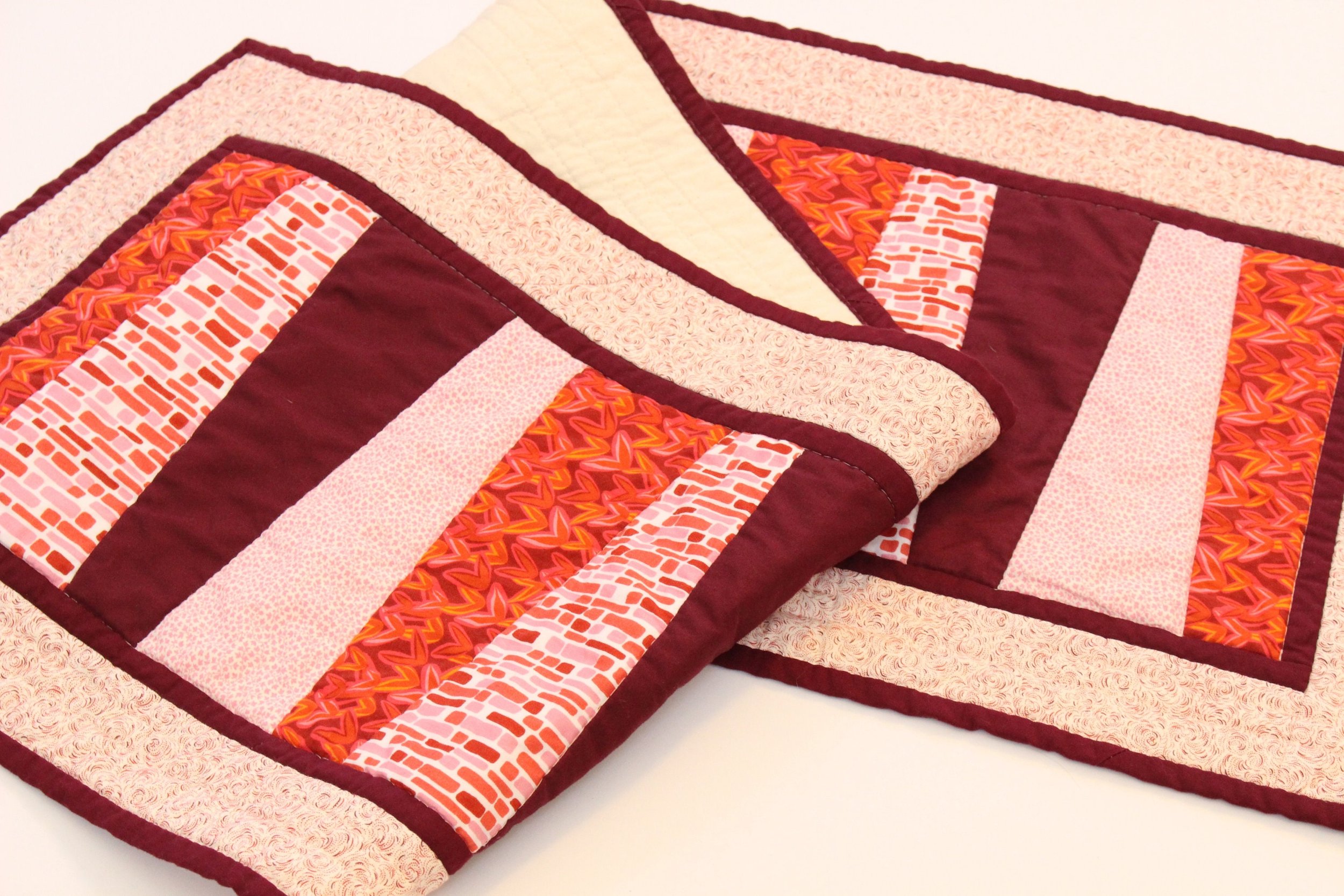 Fabulous handmade 100% pure premium cotton table runner is perfect for decorating your home for brunch, dinner party or daily dining. Classic quilted table topper is machine pieced in a playful mix of red and pink hearts, mosaic and ditsy prints highlighted with a solid deep, rich burgundy. It looks wonderful on either an island, buffet, bare table or layered on a crisp white tablecloth. Top it off with a dessert or drinks display or your favorite centerpiece. This runner is triple layered and quilted with all natural lightweight cotton batting. It is backed with a natural unbleached cotton fabric. Pretty and practical, easy care machine washable. Size: 14" wide x 50" long.