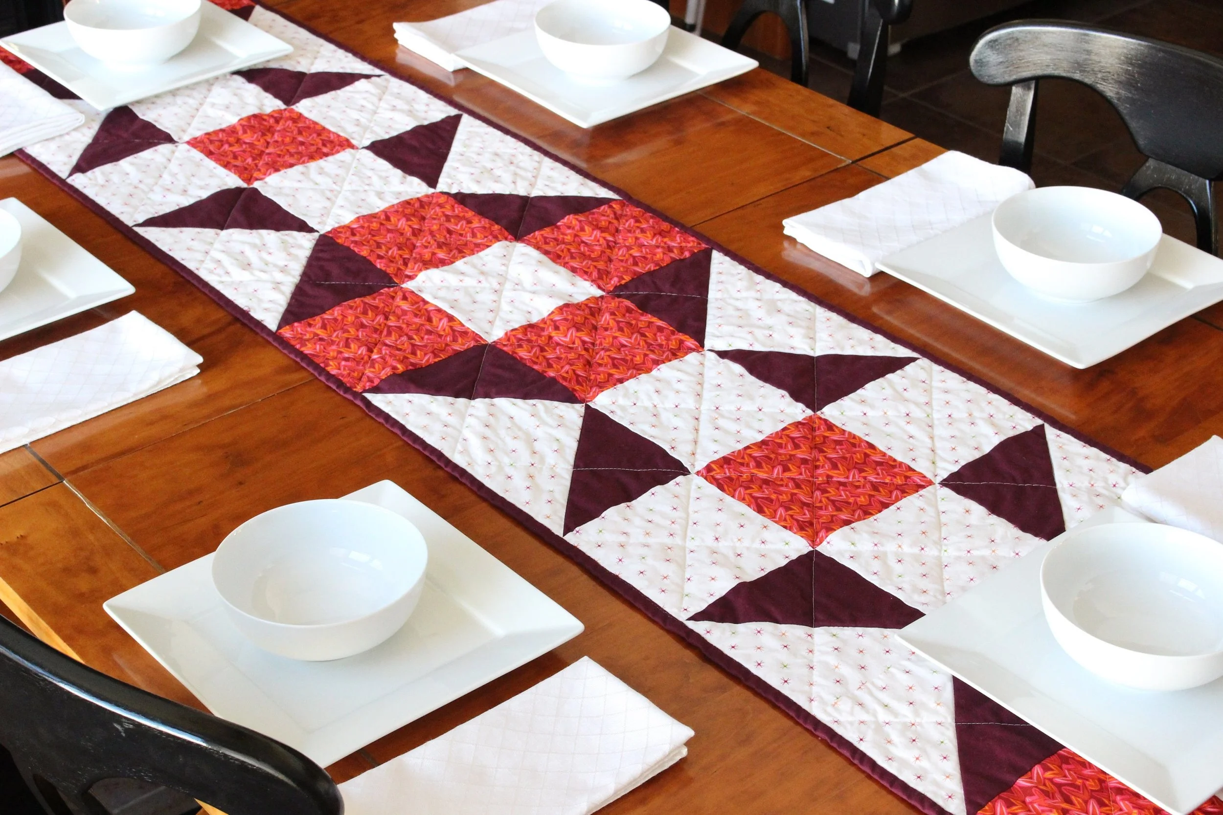 Handcrafted Table Linens: Pleasing red and pink hearts quilted table runner makes a delightfully romantic home decor accent for fun Valentine’s Day celebrations.