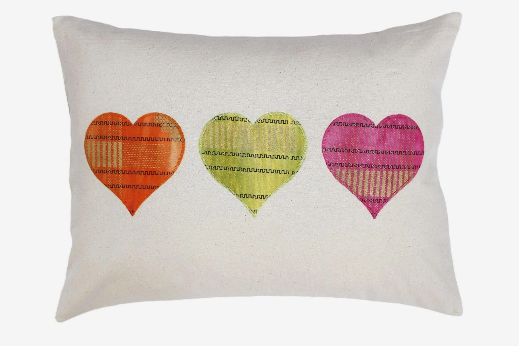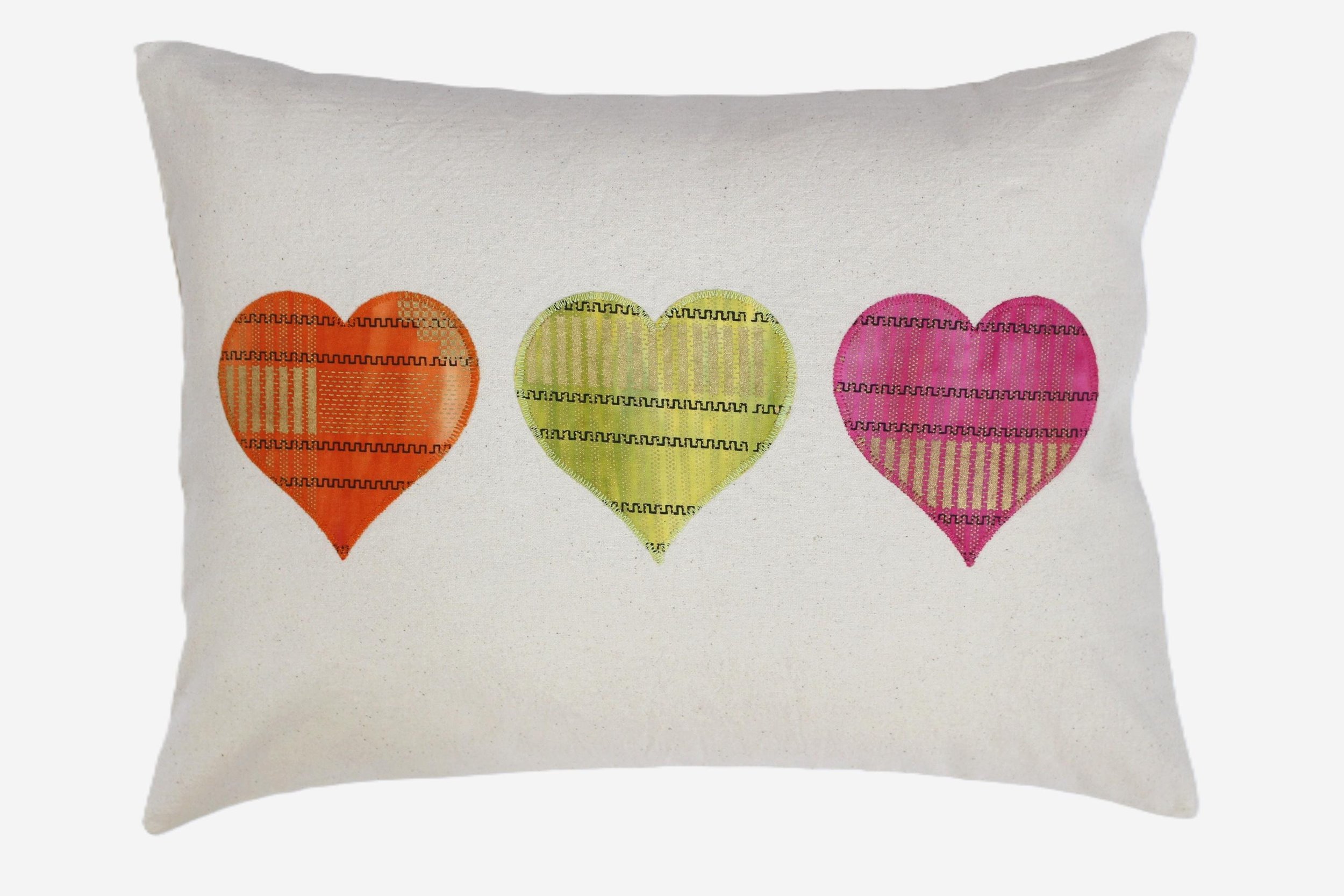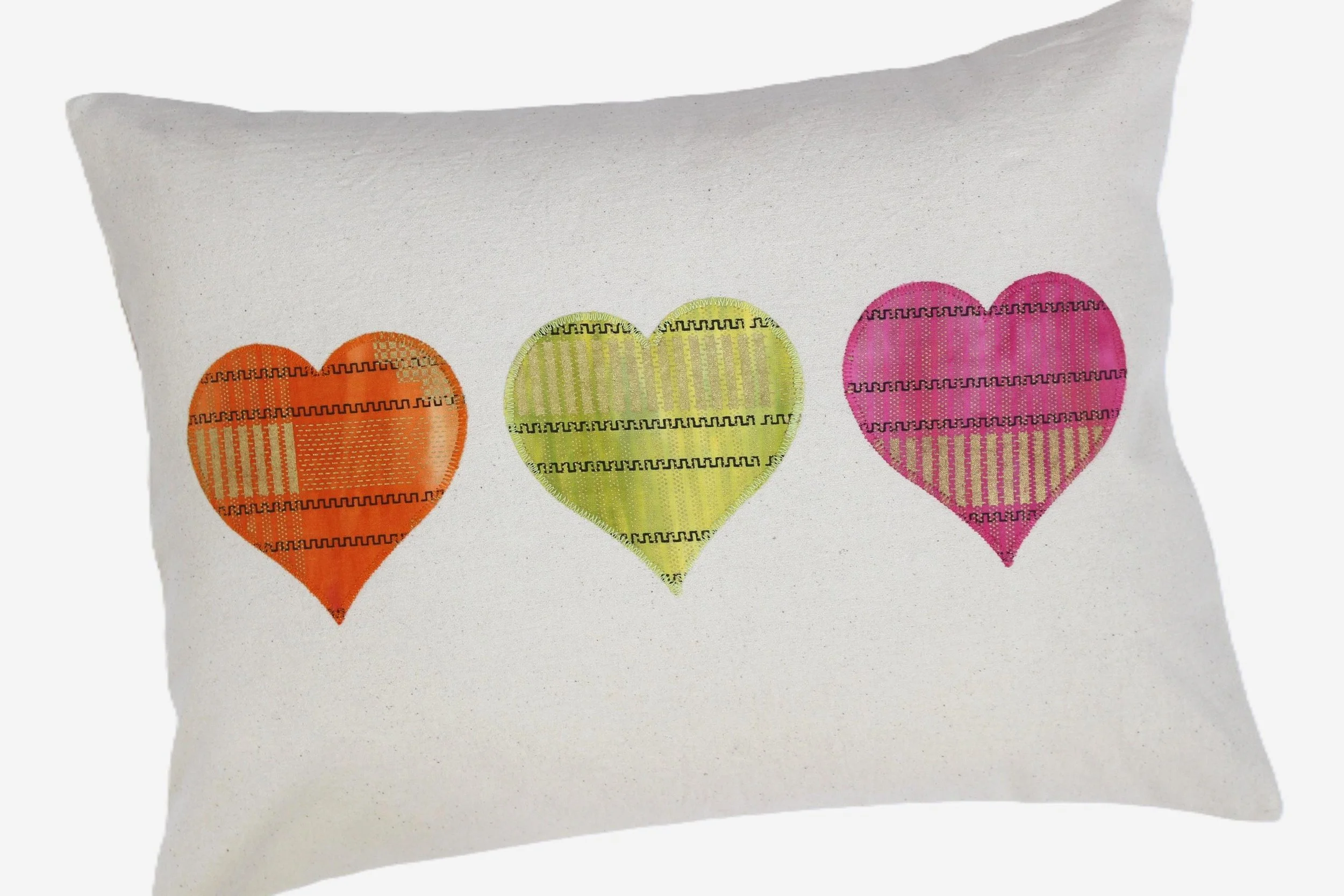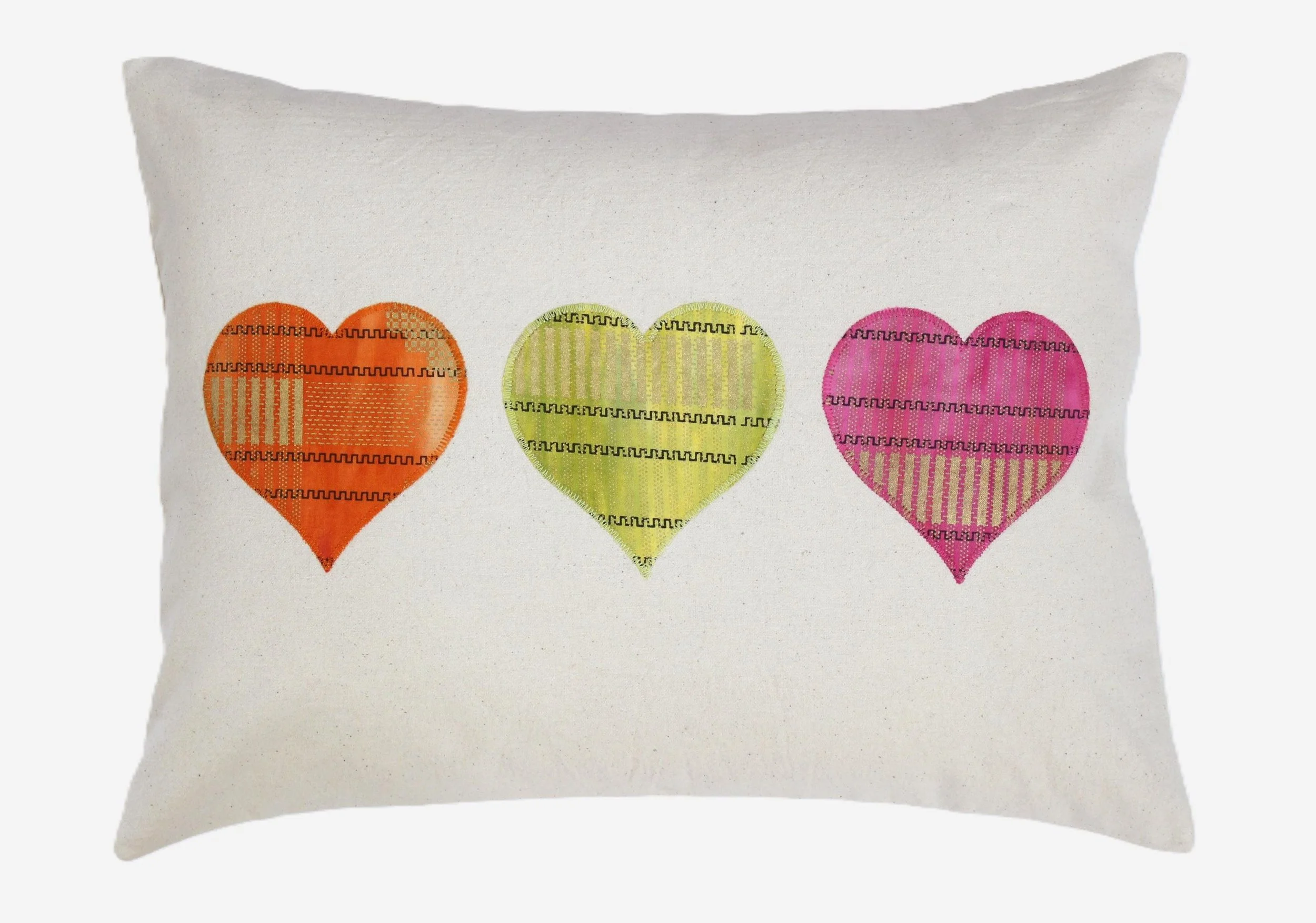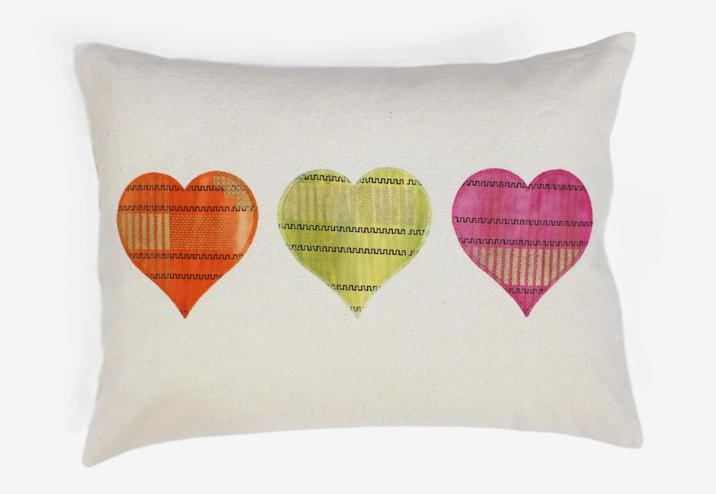 Infuse your home with a burst of artisanal color. This handmade lumbar pillow cover features a playful trio of batik hearts—in vibrant orange, electric chartreuse, and punchy pink—set against a crisp, natural off-white duck canvas.