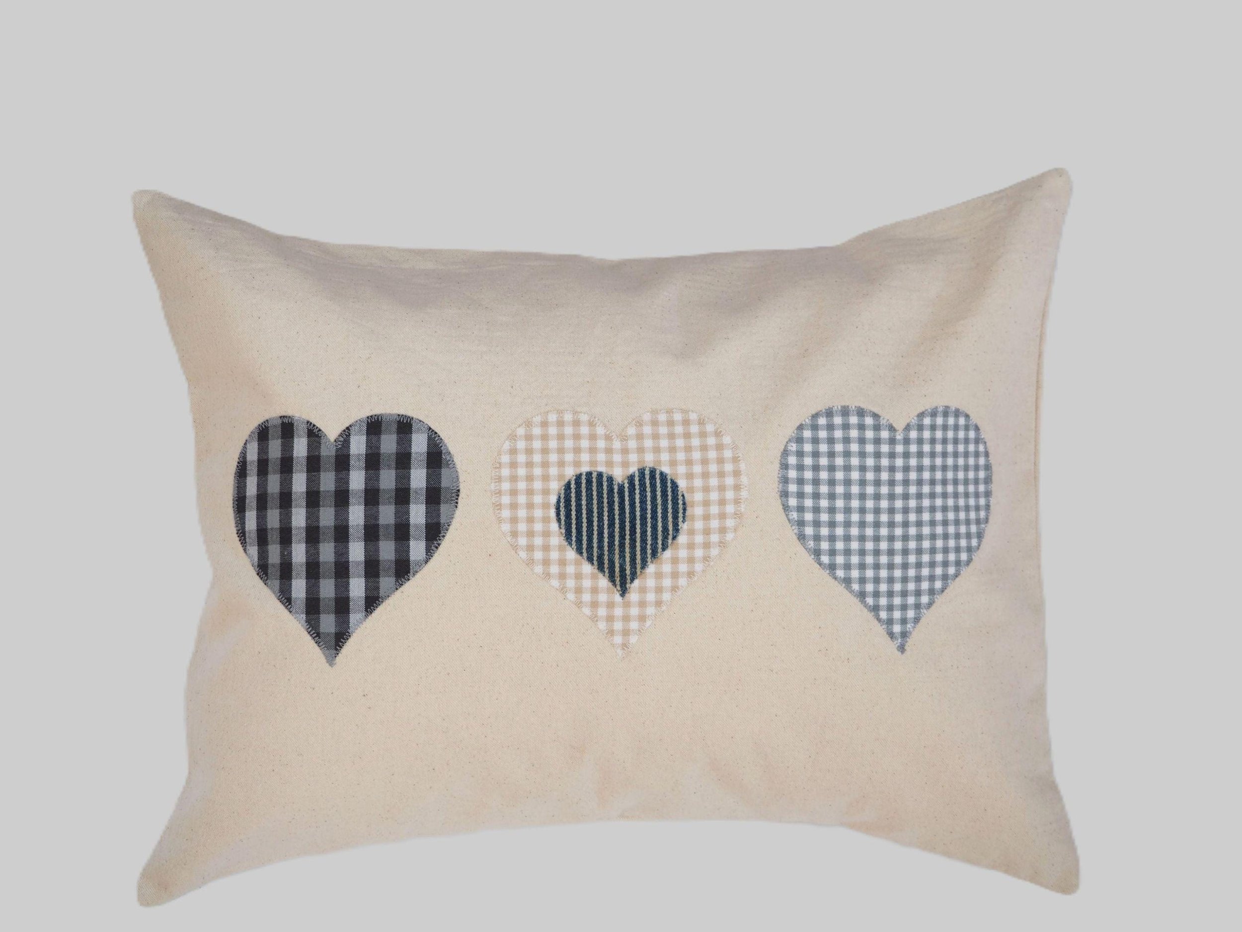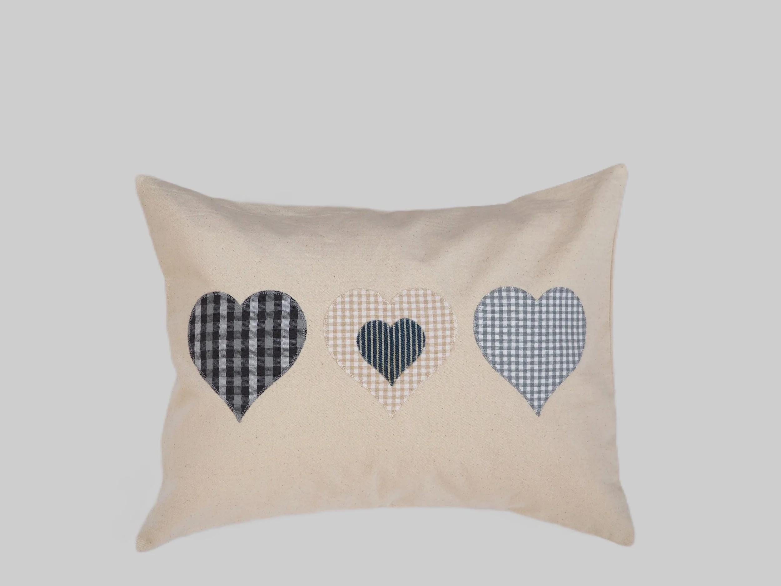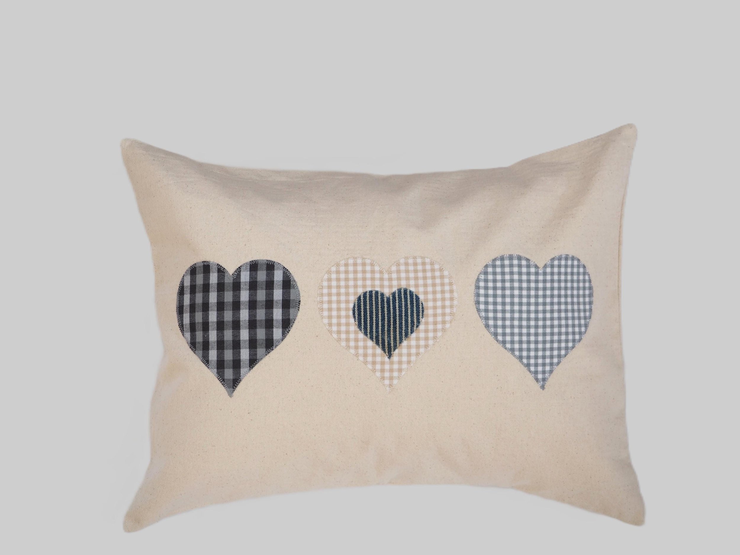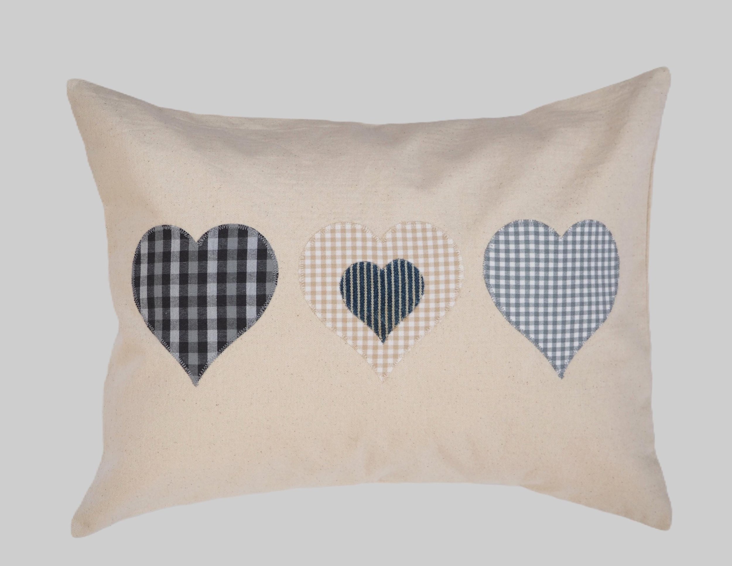 Design: Three plaid hearts appliqued on natural off-white duck canvas.