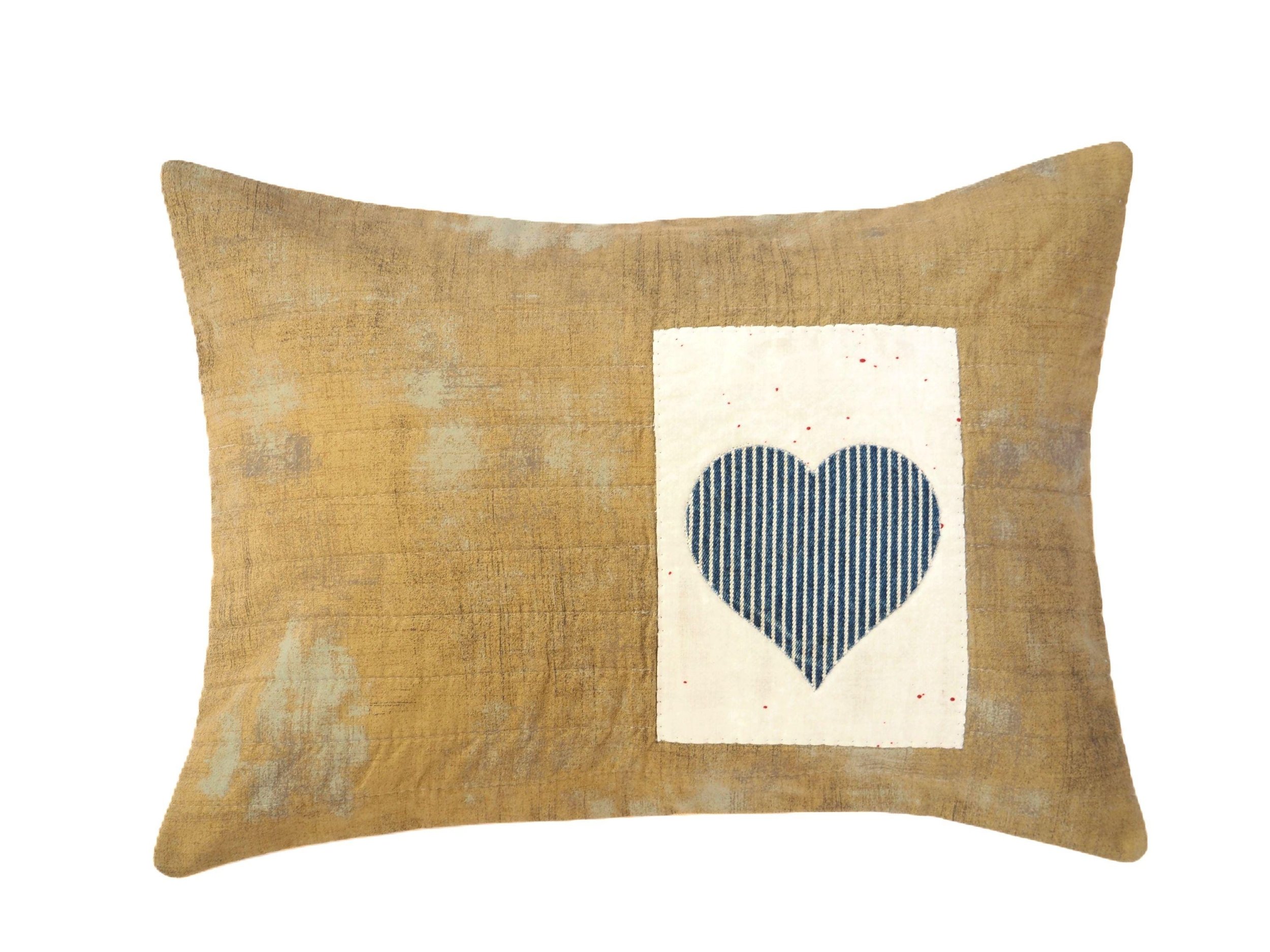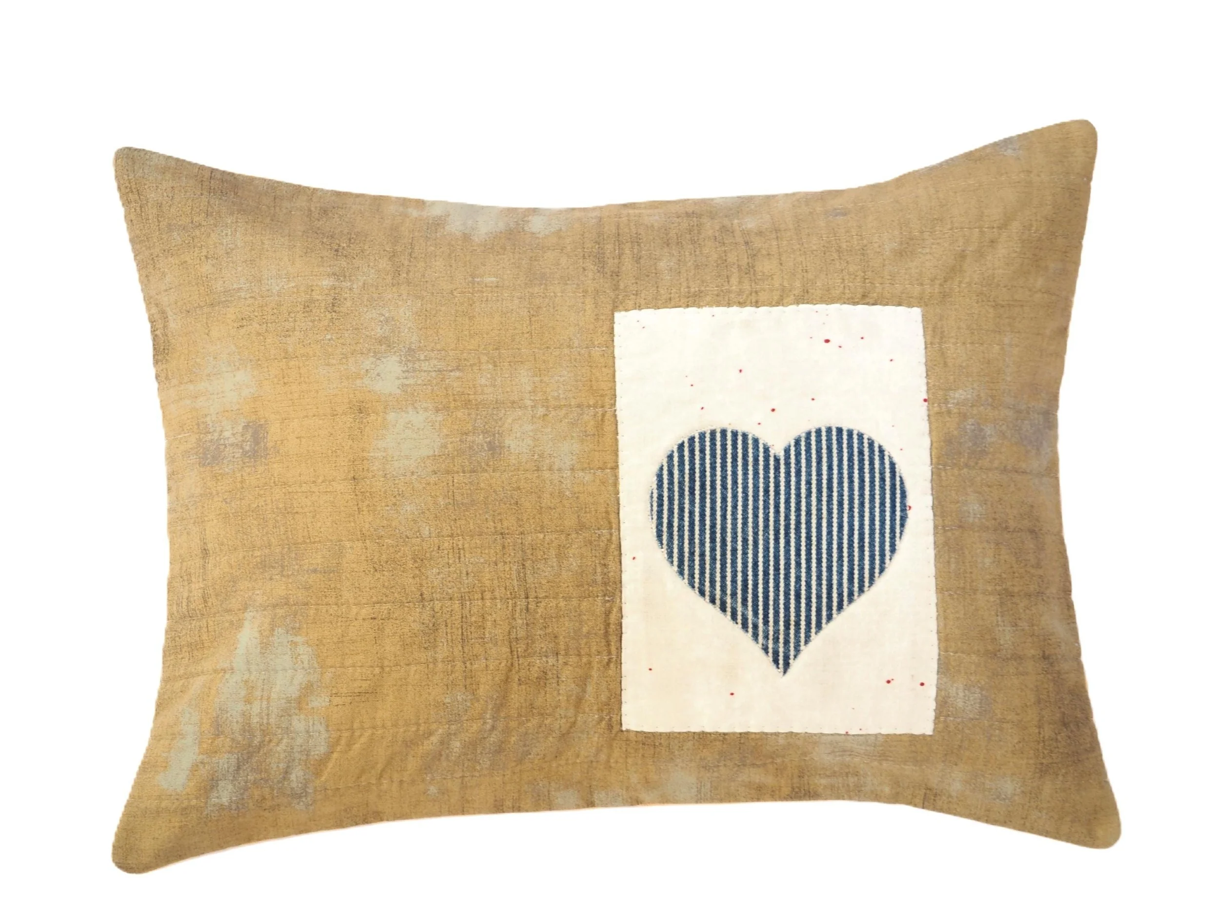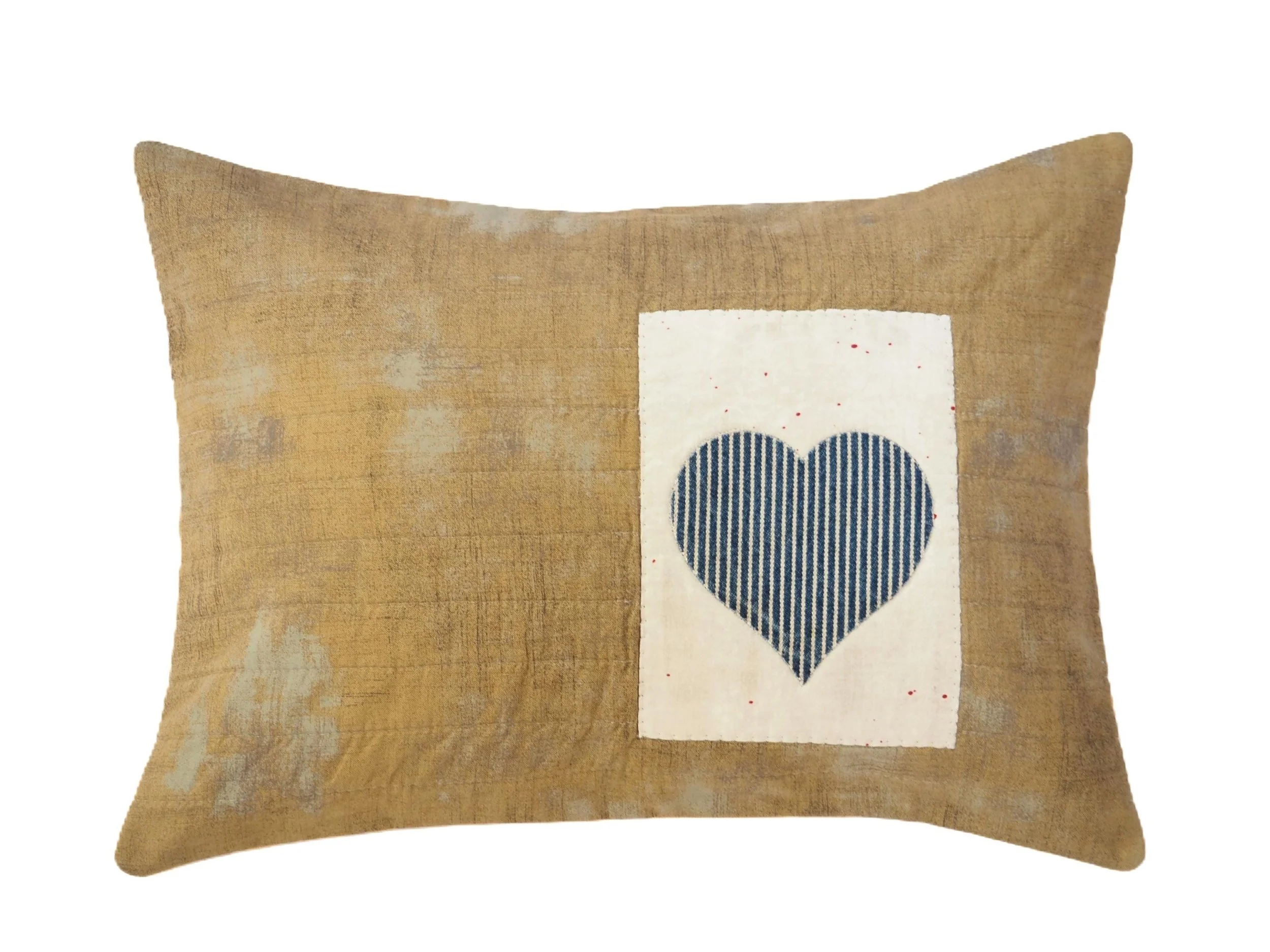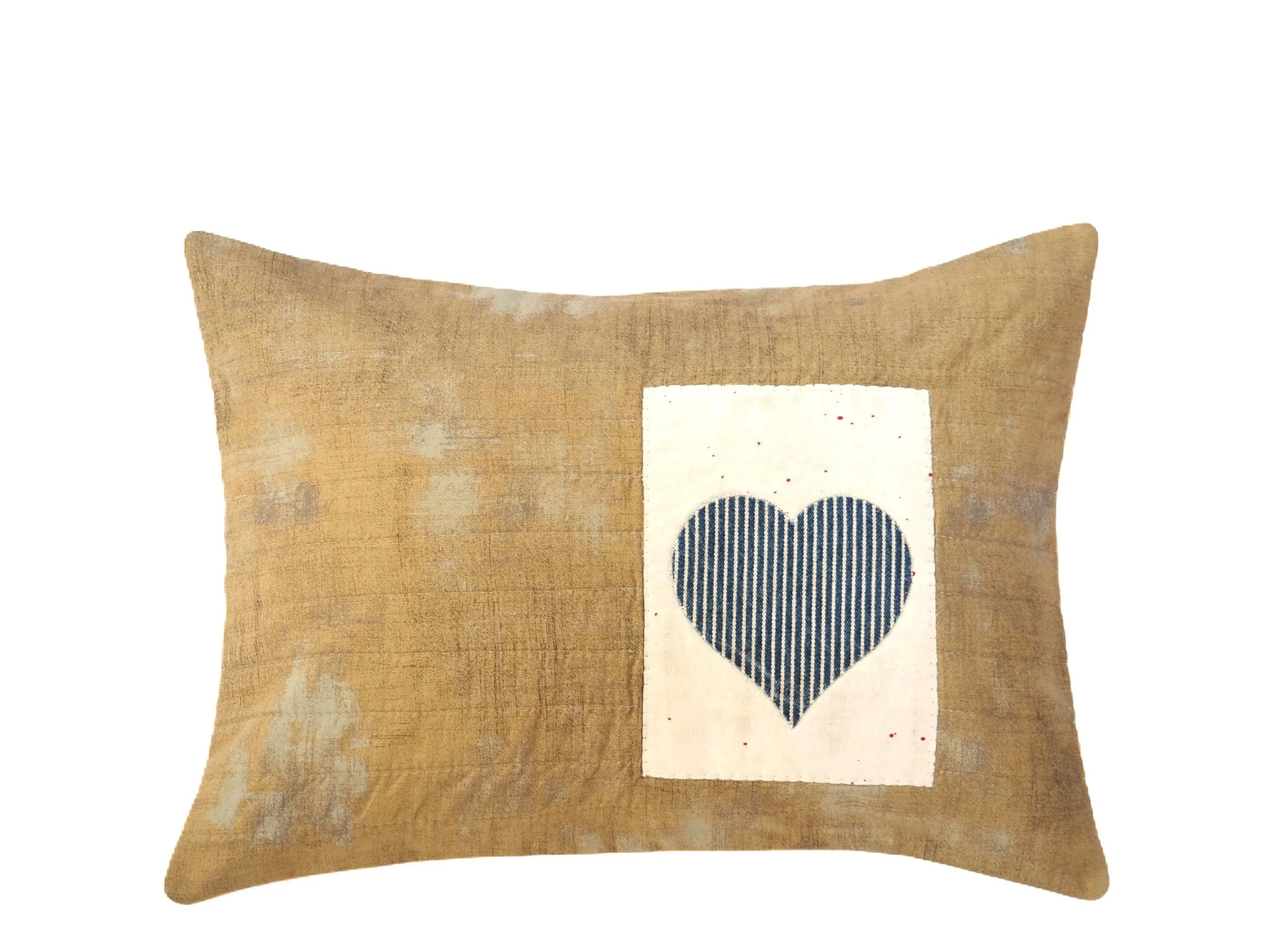 Authentic. Rugged. Heartfelt. This distressed khaki handmade lumbar pillow features a blue and white striped heart applique cut from real railroad stripe overalls used on our family farm. It will add a touch of rustic warmth to your entryway or sofa while bringing a piece of genuine American farm history into your home.